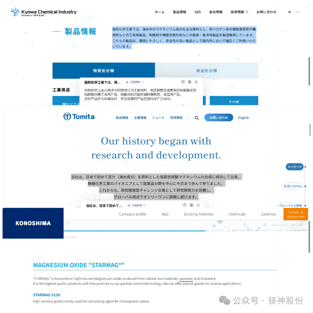 圖為相關日本公司官網將海水法制鎂鹽作為宣傳